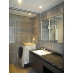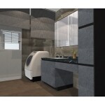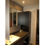 お客様がショ-ルームでお選びになった洗面台をベースにホテルのような空間になるように、エコカラットやフロアタイルを採用し内装をご提案。照明器具はダウンライトにし、お客様の要望で調光できるようにしました。