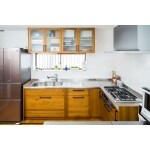 L字型のキッチンにすることで、シンクや冷蔵庫へ行く距離が短くなりました。また、冷蔵庫の位置を変えることで、冷蔵庫、シンク、コンロへの動線もスムーズになりました。