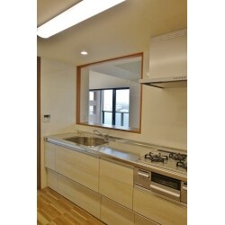 高台に立地する、このマンションはテラスサッシから富士山、大山など丹沢の山々を 望むことが出来ます。 キッチンの吊戸棚をなくして天井いっぱいまで開口を広げた例です。