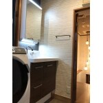 洗面台は幅を広げ、洗剤などの日用品をストックできるようにしました。スキンケア用品などはミラーキャビネットに隠しながら収納し、使用する際はパッと取り出しやすくなりました。 洗面台のバックガードが高いため、クロスへの水撥ねを軽減できます。