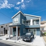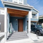 ブルーグレー×ホワイトのコントラストで青空に映えるカリフォルニアスタイルの外観に。玄関ポーチの屋根にはレッドシダーを貼り、デザイン性をアップ。デザインのコンセプトは「カリフォルニアスタイル」。御施主様が好きなブルーと木目をベースに細かな所までこだわりました。