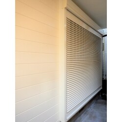 採風タイプの電動シャッターを施工しました。 リモコン操作でシャッターの面倒な開け閉めから解放され、シャッターを閉めたまま風や光を取り入れることが出来るので快適に過ごすことができます。 また、窓ガラスはサーモスLの複層ガラスなので冬暖かく夏涼しく過ごせます。