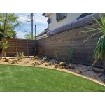 木造の住宅と広い敷地、そしてお庭の外の立派な防潮林が特徴的なお宅でした。折角の広い敷地と借景を活かすため出来るだけ素材は少なくシンプルに、広々としたデザインにしました。 見た目のカッコよさはもちろんのこと、人工芝と砂利・石をベースにデザインすることで「ナチュラルテイストだけどローメンテナンス」を実現しています。