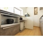 キッチンとお揃いの家電食器収納を壁沿いに配置。 有効巾90cmを確保しているので、引出収納も楽々引き出せます。2人並んでも動きやすいです。 ゴミ箱も扉付で生活感を感じさせないよう工夫されています。