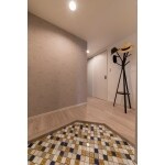 お出かけ前のチェックができる姿見も取付け、理想の空間を作りました。玄関の床タイルは、お気に入りのランタン型のコラベルタイルを貼り、レトロな心地よさのある雰囲気に。