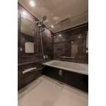 上質な光沢のある人造大理石(ルフレトーン)浴槽と、高級感がある組石グレーのパネルがホテルライクなバスルーム空間を演出しています。