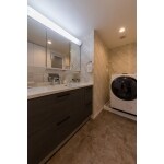 お手入れ簡単な人造大理石ボウルと、小物ポケットなど細かく仕切れる使い勝手の良い収納が魅力のベースキャビネット。キッチンと扉カラーを合わせ、水まわり全体を高級感のあるイメージで統一しました。