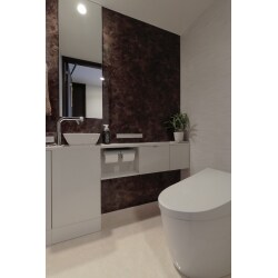 床材は耐久性、耐水性、耐薬品性にすぐれているフローリング『ハピフロア』、アクセントウォールの鏡面調石目柄に合わせて床も鏡面調石目柄(ともに大建の壁材・床材)でトータルコーディネート。 キャビネットはフローティングタイプでトイレ空間はスッキリ! サイズオーダーの鏡と石目柄のアクセントウォールの組み合わせはホテルで過ごすような贅沢な空間になりました。