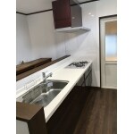 スペースを考慮したカーブを描くやわらかな曲線デザインの、まる洗いカウンター(ワイド)を設置。 床はキレイサーモフロアで、スポンジでお掃除ラクラク。寒い冬場でも、冷ヤッとしません。