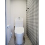 ウォシュレット一体形便器トイレですっきりとさせ、シンプルな中にも、チェックのアクセントクロスにアイアンのタオル掛けで個性と、全体の雰囲気を統一させました。