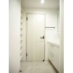 壁面埋込収納を無くし、三面鏡にして収納を増やし、また洗濯機上にも棚を設け大容量の収納を確保しました。