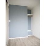 扉を引き戸へ変えて、カーペットからフローリングへ変えた洋室。収納の扉を無くし、凹凸の有る壁面にブルーグレーアクセントクロスを貼って陰影を出しました。