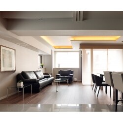 お子様が独立して夫婦二人になったマンションの改装工事。ご主人の仕事の関係で、自宅での作業や来客のもてなしも多いとのこと。和室を書斎として使われていましたが使い勝手が悪いと感じてらっしゃいました。また、奥様は来客時にリビングに物が溢れていることがストレスに。適材適所に収納が充実した広いリビングと水まわりを希望されており、かつ上質な住空間を演出する素材へのこだわりをお持ちでした。