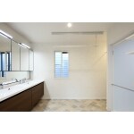 化粧台のトールキャビネットのスペースを含めると、2ボウルタイプのカウンターが設置できましたので、快適に同時使用しやすくなりますのでおすすめしました。 収納については、下部キャビネットを引出しタイプにして、奥まで使用しやすく、また、浴室を小さくすることで広くなった収納スペースを、可動棚やハンガーパイプで充実させるご提案をしました。