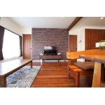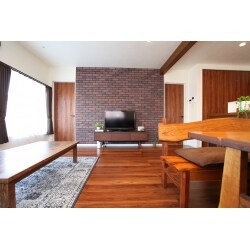 テレビの背面には、ニッタイのマジカリブリックタイルを採用。 レンガを積み上げたような風合いがとても素敵です。