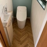 お掃除がしやすく、除菌水でノズルを除菌することができるトイレになりました。床はクッションフロアで仕上げています。