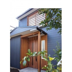 縦張りの個所が新しくガルバニウム鋼板で張替た場所、既存外壁部分を同色で塗装しています。高耐久木材「ウリン」で玄関ドア廻りや2階格子を造作しています。