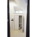 階段の下のトイレ。階段は以前より勾配を緩めましたので、便器の配置を変え、たっぷり収納に姿を変えました。