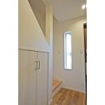 袖壁をなくし、ドアは片開きに変更したため土間が広く使えるようになりました。脇には天井までのシューズ収納を設置。