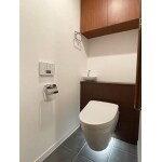 TOTO レストパルF I型にお取替え。 レストパルFは便器が宙に浮いているフローティングデザイン。高級感のあるデザインでかつ床面全体がフラットでお掃除がカンタンです。 入室すると自動でやわらかフロアライトが点灯、退室すると自動で消灯します。