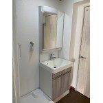 配管を隠し、給水・給湯・排水配管を調整し60センチの化粧台を設置できるよう提案いたしました。また、ミラー付きのため鏡の裏も衛生用品などを収納できるような製品をご提案させていただきました。