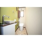 凹凸が少ないのでお掃除らくらくな 一体型トイレネオレストと 壁面には気分も踊るグリーンの壁紙 でアクセント。 停電時の安心設計の機能も付いているので もしもの時も安心です。