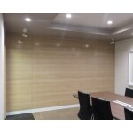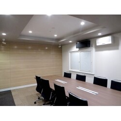 ・正面壁一面を使い、会議用資料を掲示して、スムーズに貼り替えがしたい。プロジェクタースクリーン用にも使用したい。 ・映写時に適した明るさにしたいので間接照明を設置したい。 ・手元の資料が見やすい様に、調光式のダウンライトを設置したい。