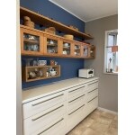 トクラス Berry にお取替え。 背面収納は吊戸棚を撤去して、たっぷり収納できる3段引き出しキャビネットを設置しました。濃紺色の壁紙が映える素敵なキッチンになりました。