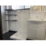 洗面台は価格的にもお手ごろなパナソニックMX、大工工事で可動式の収納棚を製作。