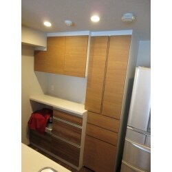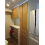 既存のカウンター収納や、梁などのサイズに合うように設計いたしました。 またなるべく圧迫感のないようなサイズにし、 既存の収納スペースと同じ色はありませんでしたが雰囲気の合うカラーを選びました。
