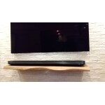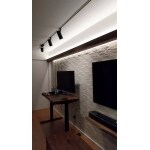 ウォールナット材をイメージした化粧梁を造作し、梁内部に壁面と天井面を照らす照明(コーブ照明・コーニス照明)を取付ました。 テレビ下にウォールナットの一枚板(約14kg)を金具が見えない様に裏面から補強し取付させていただきました。