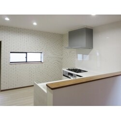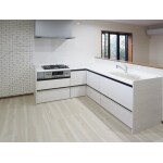 キッチン自体を明るくするだけでなく、内装も白中心に。 キッチン面材:ホワイト系木目調、 壁クロス:ホワイト系レンガ調、 床をフローリングからホワイト系木目フロアタイル にしてキッチンが明るくオシャレになりました。