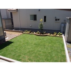 お庭の一区画を芝生へ。 またレンガにて花壇を設け、植栽を植えてました。 仕切られていることでお手入れする場所が明確になり、気軽にガーデニングを楽しむことができます。