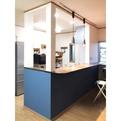抜かない柱はそのままに、キッチン前にカウンターを新たに設けてカウンターバーのような雰囲気に演出。カウンター下をダークブルーにすることでシックで落ち着いた印象に換えました。