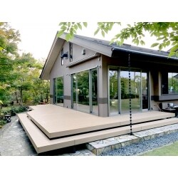 ウッドデッキを樹脂製にしたことで、雨水や腐食に強いウッドデッキを実現。ウッドデッキの色を室内の床と合わせる事で、内外が一体的に見え室内が広くみえる効果が出ました。