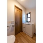 収納アイテムが多く生活感が出やすい洗面室。キレイ好きな奥様が選ばれたのは、リクシルの洗面化粧台L.C.。扉面材をカームウッドライトで優しく全体を統一しました。