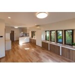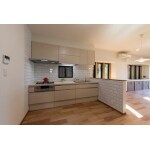 リビングよりキッチンをみた所。 廻縁も無くなり、木目の色味も変わり、スッキリとした印象に。