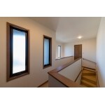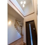 玄関ホールから続き、明るい木目で統一された、 吹き抜けのある開放的な2階廊下。