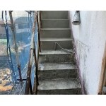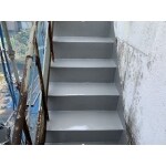 外階段のウレタン防水工事。弊社の防水工事の工程は、既存の塗膜浮き部の撤去後、下地処理、プライマー塗布、ウレタン防水 主剤を2度塗り、トップコート塗布で完了です。