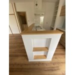 レイアウトを変え、対面式キッチンへ。 壁面のアクセントクロスが、イメージをガラリと変え、温かいキッチン空間を演出してくれます。 また、カップボードの間に設置された飾り棚は、インテリアがお好きな奥様のご希望。