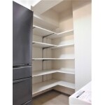 独立したパントリーを作るのは、スペース的に難しいため、隣の洋室との間の間仕切り位置を変え、まとまった収納量が確保できるL型の可動棚の設置をご提案しました。