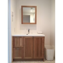 中古物件購入後キッチン以外の水廻りはそのままでしたので、交換したいとのご依頼をいただきました。 無印良品の家具や雑貨で揃えられていたことから、ナチュラルな雰囲気がお好きと考えウッドワンの「無垢の木の洗面台」を提案しました。オーク扉のクリア塗装で温かみがありながら落ち着いた印象になりました。 小さなお子さんが使用される為、正面と左側にお手入れが簡単なサニタリーパネルを施工。 サンプルを取り寄せ打ち合わせを重ね、無垢の雰囲気に合う一番マットで主張のないものに決まりました。 お家の雰囲気ととても合い、奥様に大変気に入って頂くことができました。