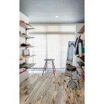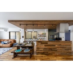 LDKの中央のダイニング・キッチン空間の天井や床の柄を変えて存在感を出したり、各扉のデザインや配色、照明・室内窓やキッチン腰壁に古材を活用したりなど、LDKの360°どこを見渡してもかっこいい空間になるように工夫しました。 モザイクタイルで波を表現したところも拘りです。 キッチン背面には魅せる収納としてカウンターだけ設け、食器棚や食材ストックなどは奥のパントリーにしまうことで、メリハリのある使い方ができるようになっています。 ウォークインクローゼットは、お洒落な服・小物をたくさん持ってみえるご家族様がショップのようなイメージで使っていただけるよう広めの空間にしました。 トイレもLDKから直接アクセスできますが、出てきた人とソファーに座っている人との目が合わないよう、手前の壁にチェッカーガラスを組み込みました。