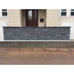 手入れがそこまで必要ないように、青石や化粧砂利を敷きました。また外観が西洋デザインでしたので、ジョリパッドと天然石材を用いて外構をデザインしました。
