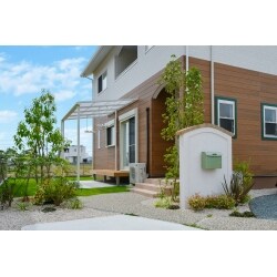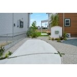 程よく曲線を用いた外構へと仕上げました。土間にも緩やかな曲線を用いることで、優しい印象になります。目地にはアクセントでタマリュウを入れることで動きを強調。庭のテラス屋根は日常の洗濯物はもちろん、自転車も止めやすくするために、ウッドデッキはあえて出幅を出していません。