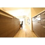 キッチンの床は清掃性に優れる塩ビタイルを張っています。
