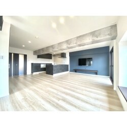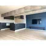 マンションということもあり、キッチンの排水が問題となり、オープンキッチンにするためにキッチンスペースだけ床を1段上げステージにしました。また梁部分はアクセントとしてコンクリート柄クロスをご提案しました。