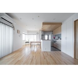 和室だったスペースをリビングからも廊下からも行き来が可能なウォークインクローゼットに。回遊動線で利便性と機能性がアップしました。 天井高も高く大容量の収納。正面にはお気に入りのクロスを。 玄関・廊下に設置されていた玄関収納をなくして、シューズインクローゼットにすることで、靴や玄関周りの雑多なものを収納でき、玄関・廊下はすっきりと拡がりのあるスペースに。出入口はアーチ開口でおしゃれにお出迎え。 洋室を和室へと変更しリビングの一部に取り込むことで、LDKは明るさと拡がりのある空間になりました。 タモ材で作った造作ルーバーで仕切ることで、空間をゆるやかに隔てています。 キッチンの下がり天井部にはタモ材の木パネルを貼り、お好きな形やガラス・取手で建具屋さんに造作してもらったリビングドアは、LDK全体をナチュラルな雰囲気に演出します。 お施主様の選ばれたアクセントクロスや床材、お部屋に飾られたかわいい小物たちにも好きが詰まって、光溢れる居心地のいい住まいになりました!