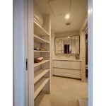 スライド収納と三面鏡裏の収納で収納力もアップ。 また廊下だけでなくLDKからも直接アクセスできる動線に変更しました。
