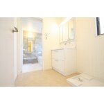 間取り変更により、入口向きを変え、シンプルで使いやすい向きに変わりました。 洗濯機置き場も新設し、脱衣所として完結出来る様になりました。 引出収納、壁出し水栓の洗面台は人気の設備です。